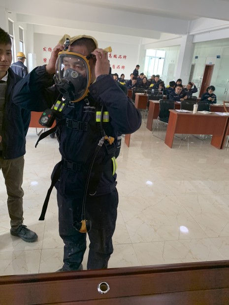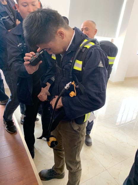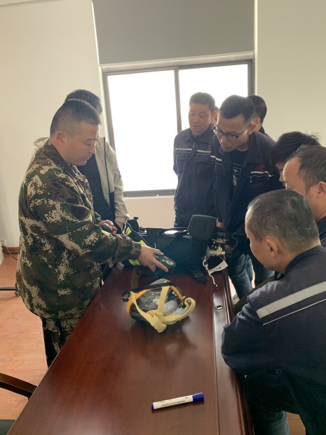 消防隊長姜正海親自示范空氣呼吸器的佩戴方法,并詳細介紹了產(chǎn)品結構,維護,注意事項,故障及維修等問題。同時親自指導員工如何穿戴消防服,并告知穿戴要領。