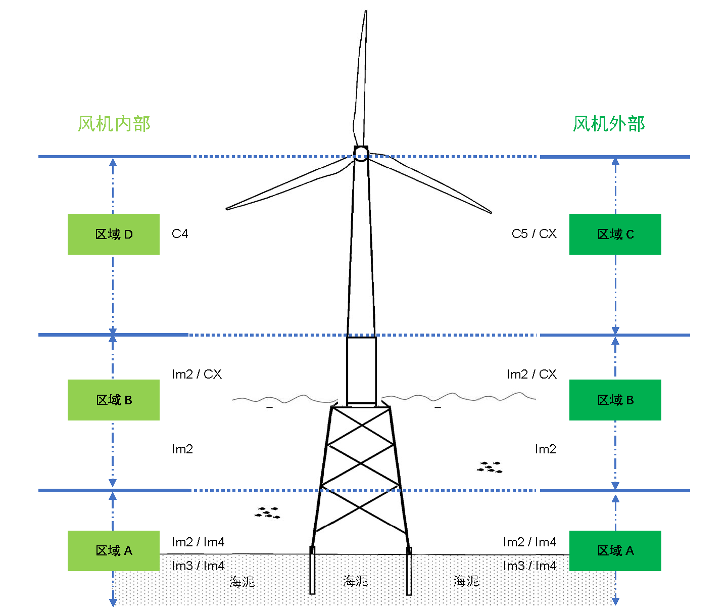 海上風電的腐蝕環境較為嚴酷,其腐蝕區域可分為:海洋大氣區、浪濺區、潮差區、海水全浸區和海泥區,風電機組。